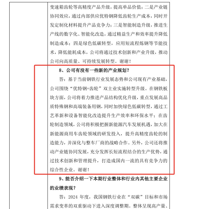 基于當前鋼鐵行業(yè)發(fā)展態(tài)勢和公司現(xiàn)有產(chǎn)業(yè)基礎,公司圍繞“優(yōu)特鋼+齒輪”雙主業(yè)實施轉(zhuǎn)型升級。在鋼鐵板塊方面,公司將著力推進產(chǎn)品結(jié)構(gòu)優(yōu)化升級,重點發(fā)展高品質(zhì)特殊鋼和高端裝備用鋼,同時加快綠色低碳轉(zhuǎn)型,通過工藝革新和設備智能化改造提升生產(chǎn)效率和環(huán)保水平;在齒輪制造領域,公司將積極把握新能源汽車發(fā)展機遇,加大在新能源商用車齒輪領域的研發(fā)投入,提升高精度齒輪的制造能力,并深化與整車廠商的戰(zhàn)略合作。另外,公司還將推動產(chǎn)業(yè)鏈協(xié)同發(fā)展,充分發(fā)揮長短流程結(jié)合的生產(chǎn)優(yōu)勢,通過技術創(chuàng)新和管理提升,打造成國內(nèi)一流的具有競爭力的綜合性企業(yè)。