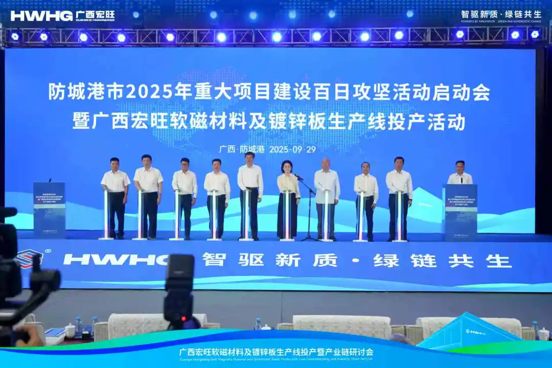 9月29日,廣西宏旺軟磁材料及鍍鋅板生產(chǎn)線投產(chǎn)活動(dòng)隆重舉行。自治區(qū)黨委常委、自治區(qū)常務(wù)副主席許永錁出席活動(dòng),防城港市委書記黃江,市長(zhǎng)邱明宏,市政協(xié)主席梁宗勇,自治區(qū)地質(zhì)礦產(chǎn)勘查開發(fā)局局長(zhǎng)、自治區(qū)實(shí)體經(jīng)濟(jì)服務(wù)員工作隊(duì)駐防城港市工作隊(duì)隊(duì)長(zhǎng)黎四龍,湖南省婁底市政協(xié)主席梁立堅(jiān),自治區(qū)發(fā)改委、工信廳、園區(qū)辦、防城港市四家班子及相關(guān)單位負(fù)責(zé)同志,行業(yè)協(xié)會(huì)專家、各金融機(jī)構(gòu)、各戰(zhàn)略合作單位,以及項(xiàng)目合作股東廣西盛隆冶金有限公司總經(jīng)理柯雪利、經(jīng)營(yíng)總裁林能鏡,宏旺控股集團(tuán)董事長(zhǎng)、總裁戴促輝,集團(tuán)副總裁朱繼喬、高志策、劉慧丹等領(lǐng)導(dǎo)嘉賓共同參與本次活動(dòng)。防城港市委常委、常務(wù)副市長(zhǎng)陶德文主持儀式。