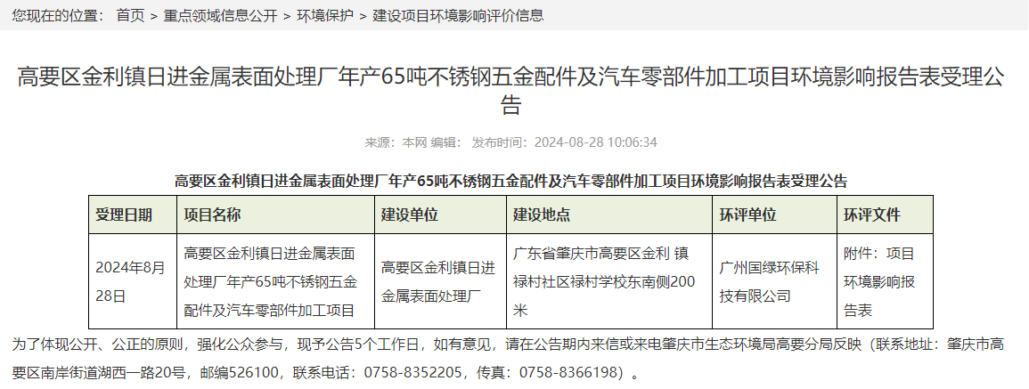 8月28日,肇慶市高要區(qū)金利鎮(zhèn)日進(jìn)金屬表面處理廠年產(chǎn)65噸不銹鋼五金配件及汽車(chē)零部件加工項(xiàng)目環(huán)境影響報(bào)告表獲受理公告,公告期:5個(gè)工作日。
