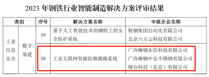 近期,在中國(guó)鋼鐵工業(yè)協(xié)會(huì)、鋼鐵行業(yè)智能制造聯(lián)盟共同開(kāi)展的 “2023年鋼鐵行業(yè)智能制造解決方案及典型場(chǎng)景應(yīng)用案例遂選”活動(dòng)中,柳鋼東信公司“工業(yè)互聯(lián)網(wǎng)智能防御溯源”攻關(guān)方案入選2023年鋼鐵行業(yè)智能制造解決方案名冊(cè)。