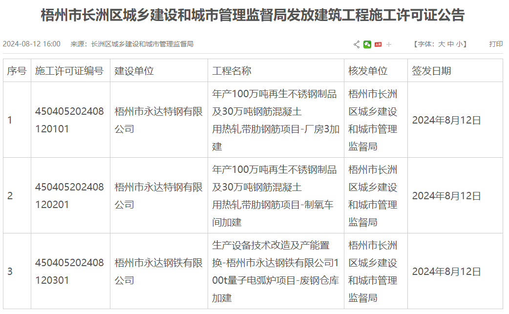 8月12日,梧州市永達(dá)特鋼有限公司年產(chǎn)100萬噸再生不銹鋼制品及30萬噸鋼筋混凝土用熱軋帶肋鋼筋項目廠房3加建、制氧車間加建以及100t量子電弧爐項目廢鋼倉庫加建均獲建筑工程施工許可證。