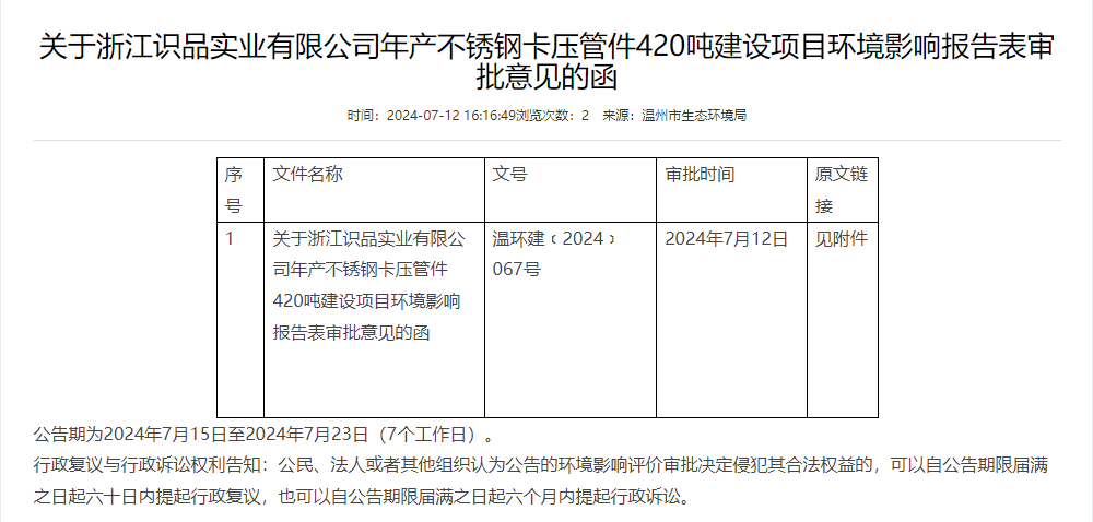 7月12日,溫州市生態(tài)環(huán)境局就浙江識品實(shí)業(yè)有限公司年產(chǎn)420噸不銹鋼卡壓管件建設(shè)項(xiàng)目環(huán)境影響報(bào)告表作出審批意見并對外進(jìn)行公告,公告期為2024年7月15日至2024年7月23日(7個(gè)工作日)。