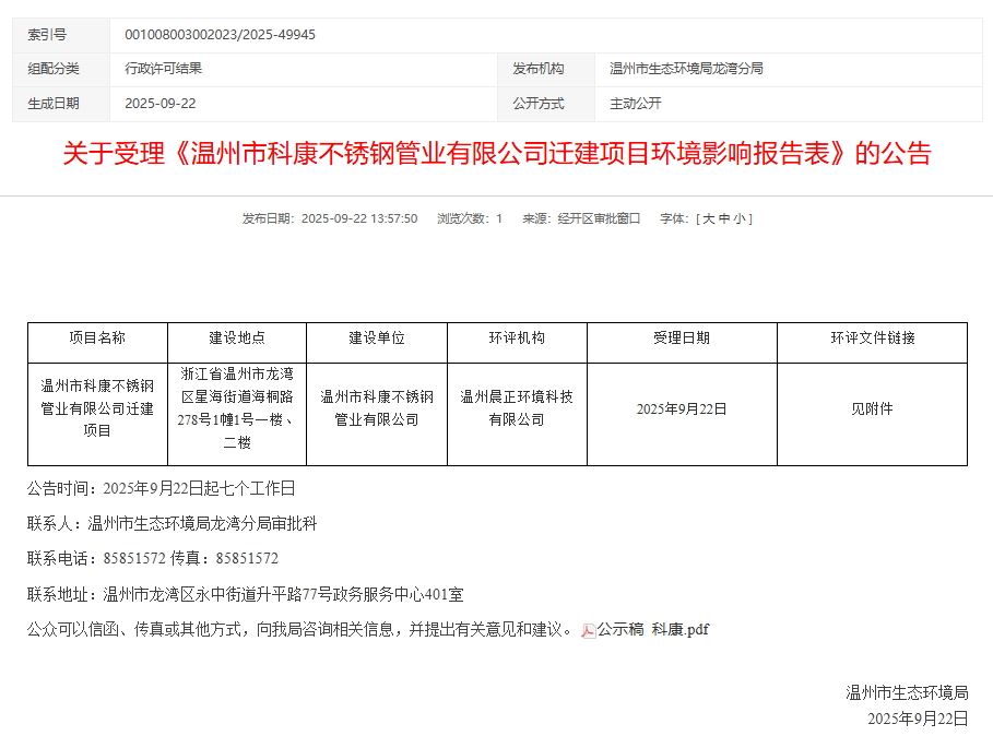 2025年9月22日,溫州市生態(tài)環(huán)境局受理溫州市科康不銹鋼管業(yè)有限公司遷建項目環(huán)境影響報告表并對外進行公告,公告期:7個工作日。