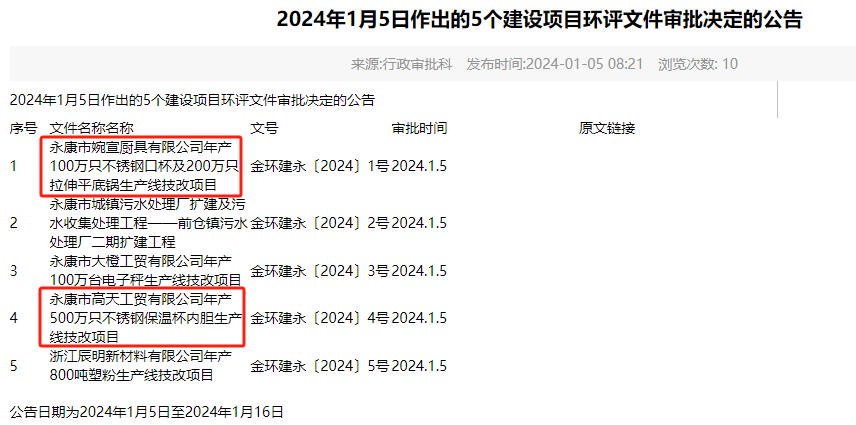 據(jù)顯示,涉及不銹鋼項(xiàng)目有2個,分別為:永康市婉宣廚具有限公司年產(chǎn)100萬只不銹鋼口杯及200萬只拉伸平底鍋生產(chǎn)線技改項(xiàng)目、永康市高天工貿(mào)有限公司年產(chǎn)500萬只不銹鋼保溫杯內(nèi)膽生產(chǎn)線技改項(xiàng)目。