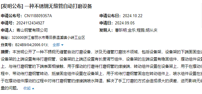 2024年10月22日,青山鋼管有限公司成功申請(qǐng)一項(xiàng)名為“一種不銹鋼無(wú)縫管自動(dòng)打磨設(shè)備”專(zhuān)利,申請(qǐng)公布號(hào)為CN118809357A,申請(qǐng)日期為2024年9月5日。