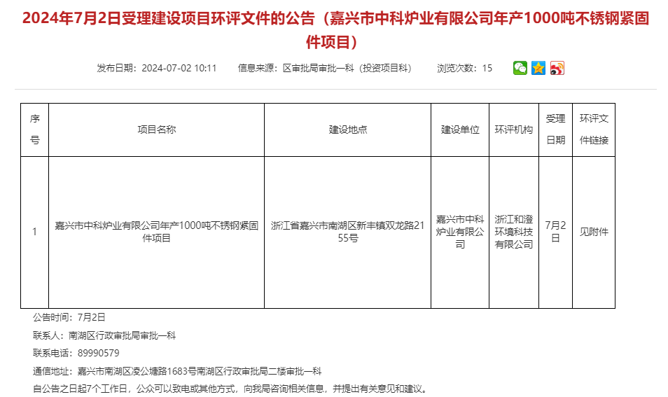 7月2日,嘉興市中科爐業(yè)有限公司年產(chǎn)1000噸不銹鋼緊固件項目環(huán)境影響評價報告表獲受理公告,公告期:7個工作日。