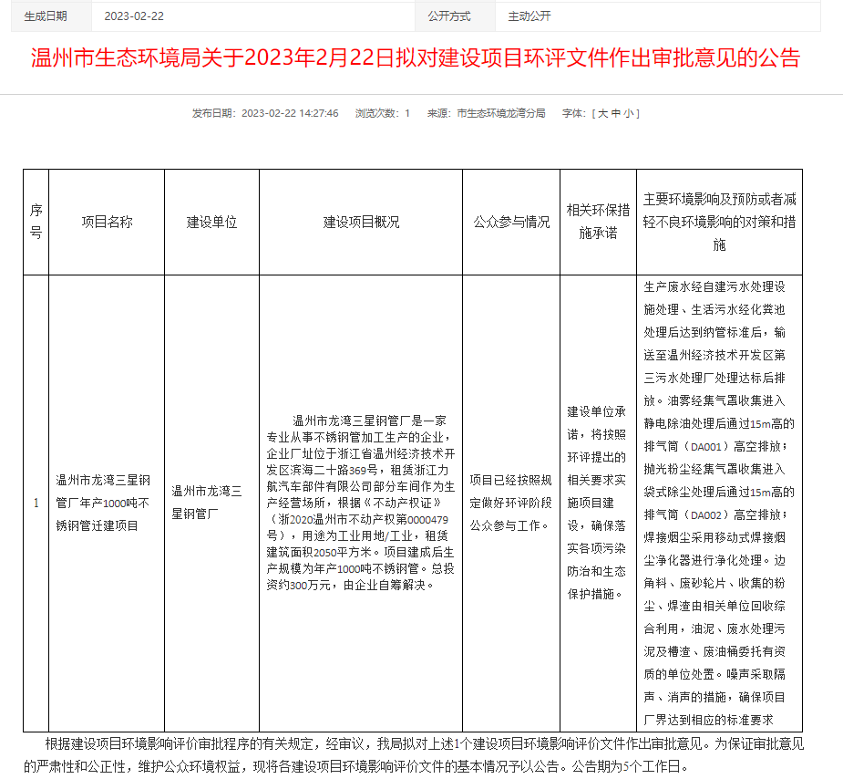 2月21日,溫州市生態(tài)環(huán)境局龍灣分局就溫州市龍灣三星鋼管廠年產(chǎn)1000噸不銹鋼管遷建項目環(huán)境影響評價報告表作出審批意見并對外進行公告,公告期:5個工作日。