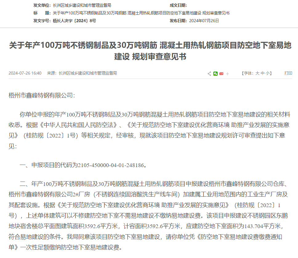 7月26日,梧州市鑫峰特鋼有限公司年產(chǎn)100萬噸不銹鋼制品及30萬噸鋼筋混凝土用熱軋鋼筋項(xiàng)目防空地下室易地建設(shè)規(guī)劃獲審查意見,據(jù)顯示,獲同意通過。